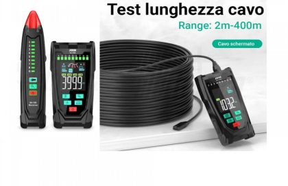 Strumento di test portatile per cavi di reti LAN dotato di una unità trasmettitore e una unità ricevitore.Il trasmettitore ha uno schermo a colori da ...